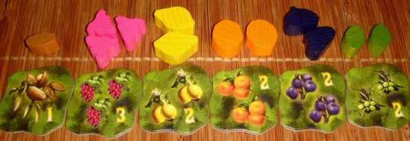 Приготовление к сбору урожая. Подготовка к игровому процессу занимает немного времени – размещаем на столе игровое поле, на 10 регионов раскладываем по 4 тайла фруктов лицевой стороной вниз – одну верхнюю открываем (чтобы видно было, какие фрукты необходимы жителям в данный момент), два лишних оставшихся тайла убираем, не глядя, в коробку. Также на каждый район кладем по одному тайлу финки – в случайном порядке, лицевой стороной вверх. Из 12 тайлов лопастей создаем ветряную мельницу – перемешиваем тайлы и раскладываем по кругу. В середину кладем ослиные повозки, рядом с полем размещаем деревянные усадьбы-финки и запасы экзотических фруктов. Игроки выбирают себе цвет, берут своих фермеров и тайлы специальных действий. Число повозок, финок, равно как и число фермеров, которые будут ходить по мельнице, собирая фрукты, зависит от числа игроков.