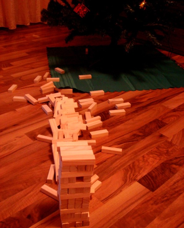 У Кати не было настроения со мной играть, и она мягко посоветовала сыграть мне соло партию. Я согласился. Партия длилась около 40 секунд. Я успел вытащить несколько брусков и поставить наверх. Но уже после третьего бруска верхушка башни скрылась под ёлкой 🙂 Вот такой вот эксперимент. Три башни – однозначно, перебор!