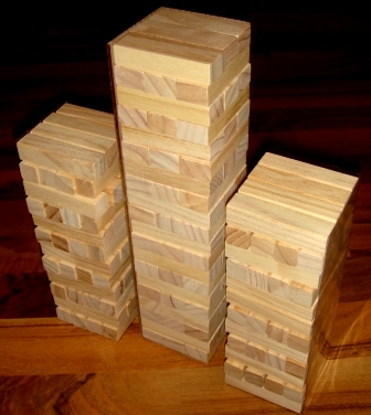 Все, наверное, знают весёлую игру для вечеринок – Jenga. По очереди одной рукой вынимаем деревянный брусок из любого ряда, кроме верхнего, и кладём его на верхушку, пока башня не свалится – это и есть весь обзор правил 🙂 Игра имеет много клонов и разновидностей. Не обошла она и нас. В самом зарождении нашего увлечения настольными играми мы приобрели себе аж две башни, т.к. они стоили копейки. Они прямо так и назывались – Tower. И, о чудо, на новогодние праздники, друзья, которые знали о нашем увлечении, но сами никогда с нами не играли и не имели понятия об играх, которые уже у нас есть, подарили нам ещё одну башню 🙂 Конечно, можно будет в дальнейшем кому-нибудь подарить, распилить на мелкие кусочки и сделать миплов для Агриколы или как-то применить в хозяйстве, но пока я решил немного подурачиться и составить все три башни вместе и сыграть. Посмотрим, что у меня получилось.