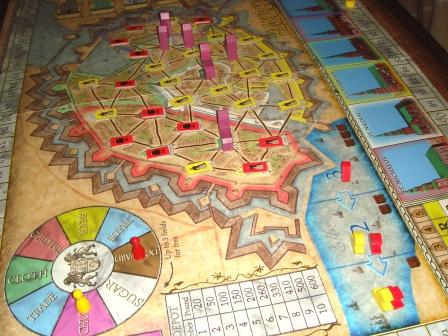 В игре действия выбираются с помощью знакомой системы “рондель” – передвигаем свою фишку по колесу на три деления бесплатно (за дополнительные деления приходиться платить) и разыгрываем действие. Цель игры заработать очки престижа. Чтобы их заработать, игроки производят товары (пиво, одежду и сахар) и продают их, строят корабли, здания и делают пожертвования на постройку церквей. После нескольких ходов мое терпение лопнуло, все компоненты мы переложили в органайзер, т.к. каждый ход приходилось доставать/класть обратно множество ресурсов и товаров. После этого игра пошла веселей, Катя скупала здания и стала безоговорочным лидером по производству сахара и пива. Из-за дефицита ресурсов мне постоянно не хватало денег, но я не унывал и делал больше пожертвований церквям. После первого часа игры, мы стали уставать. Ведь игра продолжается, пока не будет достроено 6 церквей – для двоих игроков это слишком. После двух часов партия закончилась, и явного лидера не было. По очкам я немного отстал, и все из-за одного пожертвования, которое я не успел сделать вовремя. Уверен, что игра пойдет лучше в большей компании, стратегий здесь много, можно удариться в ту или иную отрасль производства, выжидать более выгодного курса обмена пожертвований или сконцентрироваться на торговле.