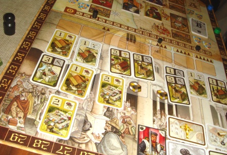 Comuni. В Comuni играли всего второй раз, в первой партии учли не все правила, а многие нюансы вообще пропустили. По отзывам и рекомендуемому числу участников вдвоем в нее играть не столь интересно, но, дабы закрепить правила, было принято решение посоревноваться в застройке и защите своей коммуны вдвоем. Основные правила просты: аукцион/получение дохода, застройка и защита от мародеров. Зато нюансов полным полно, даже при наличии в книге правил разъяснений с иллюстрациями и примерами, остается много неоднозначных моментов. Надеюсь, что после нескольких партий все прояснится, а главное – станет логически понятным.