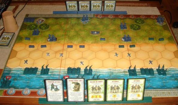 Перед союзниками, которые имеют превосходство в количестве, предстаёт вязкий пляж, защитные бункеры, танковые ежи и заросли колючей проволоки. Кроме этого, немцы имеют преимущество в виде одного отряда артиллерии. Цель: заполучить 5 медалей, это можно сделать как обычным способом, убив 5 отрядов соперника, так и захватив города. В начале партии я решил подтянуть основные силы к немецким бункерам. Но, как только мои танковые дивизии попадали в зону видимости, Катя моментально их сносила, – в этой партии на кубиках у неё выпадали сплошные танки. И хорошо, что только танки. После стартовых неудач, я набрал очень хорошие тактические карты, которые позволили мне убить несколько немецких отрядов пехоты. Так мы подошли к счету 4:3 в мою пользу. Тут я расслабился и не заметил, что два моих танковых отряда, каждый состоящий только из одной боевой единицы, оказались вплотную к вражеской пехоте. Первый удар немцев – 4:4. Тут я уже подумал, что из-за невнимательности провалил партию, но мне повезло, и второй удар врага оказался неудачным. Следующая атака союзников была успешной и победа, которая ходом ранее могла стать провалом, была за мной. Сценарий получился захватывающим, пока Мемуары не разочаровывают. Правда, во время партии пришла в голову идея, что если бы в игре было две одинаковых колоды карт приказов для каждого игрока, тогда вероятность прихода сильных карт была бы одинакова.