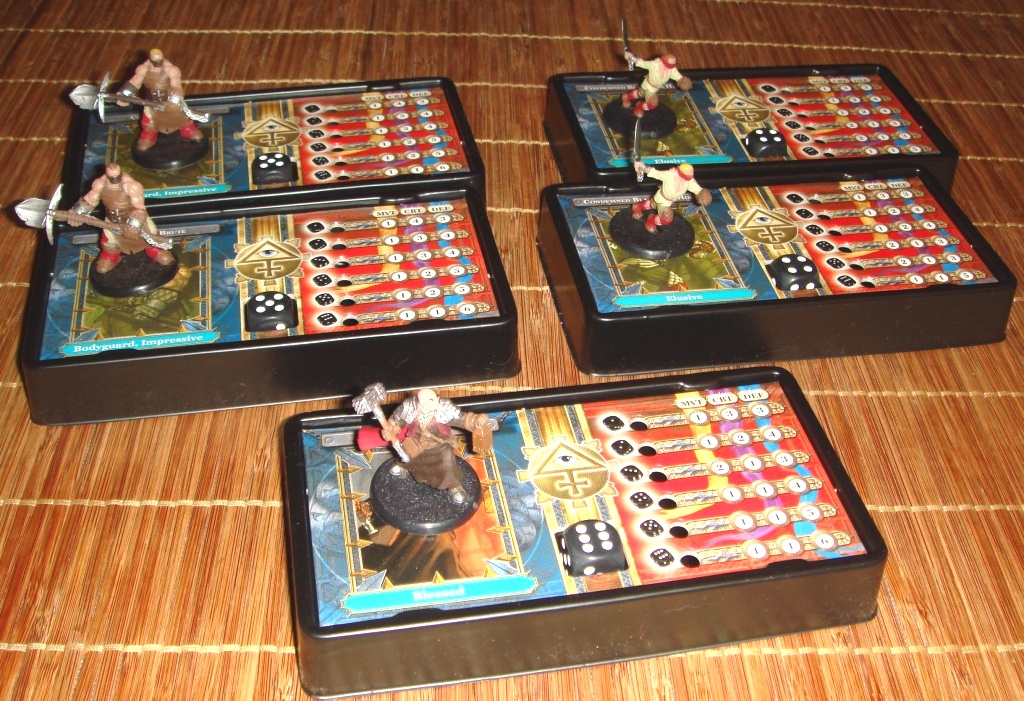 Пять героев: “Спаситель”, два “Дикаря” и два “Наемника”, осужденных и приговоренных к смерти. Каждому соответствует своя разукрашенная миниатюрка, парные герои отличаются цветом волос. К каждой фигурке прилагается памятка с характеристиками героя и подставка под нее. На подставке с помощью фишек повреждений отмечается урон, а кубик действий показывает текущую линейку характеристик игрока на каждый игровой раунд.