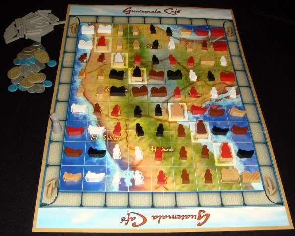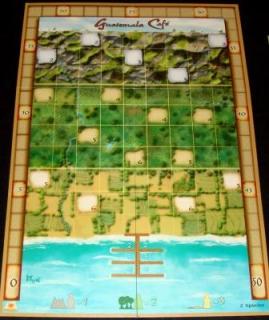 На производственное поле в начале партии выкладываются женщины-рабочие (ведь в Гватемале кофе занимаются женщины!), сушильные навесы, грузовые баржи и мешки с кофе, а освободившиеся по ходу партии клетки заполняются дорогами. Каждый игрок получает немного монет, кофейные мешки, тайлы под навесы и фишку своего цвета для подсчета очков.