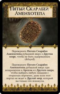 Пятый жук-скарабей Аменхотепа: В начале игры один из исследователей должен взять Выставочный предмет (Exhibit Item) Пятый жук-скарабей Аменхотепа (Fifth Scarab of Amenhotep). При его получении игрок должен скинуть один Уникальный (Unique) предмет или два Обычных (Common) предмета из своего стартового оснащения (постоянного или случайного).