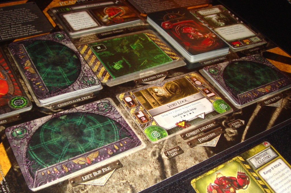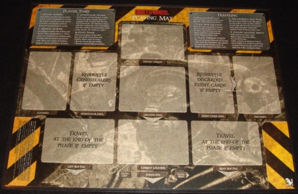 Рассматривая как-то на BoardGameGeek картинки к игре Space Hulk: Death Angel, я наткнулся на очень интересную вещь. Один итальянский поклонник этой настолки по имени Viktor Csete придумал отличный коврик для карточек – Death Angel Playing Mat. Коврик-органайзер во время партии служит местом для хранения карт Генокрадов, локаций, событий и одновременно является памяткой к игре. Для меня это актуально, т.к. я постоянно забываю порядок действий во время перехода на другую локацию 🙂