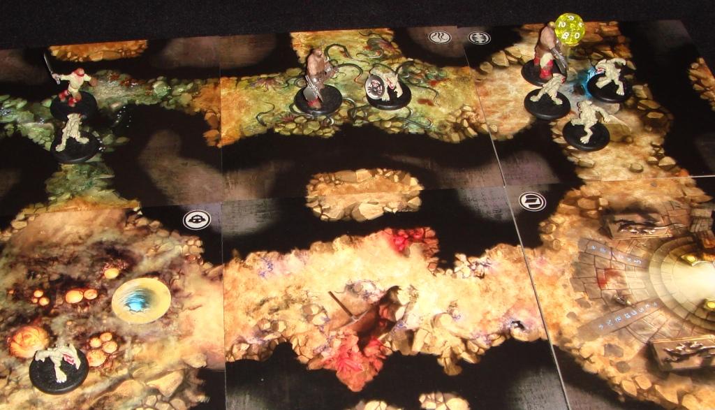 Наткнувшись на небольшой тупик, начались ещё большие трудности, ведь тратились драгоценные ходы. Троглодитов было очень много и, несмотря на все щиты и хорошую природную защиту, герои на всех получали за ход стабильно по одному ранению. Выбрав нужный момент, Наёмник и Дикарь со священным топором смогли отбиться от монстров и, благодаря карточке “Сбежать” (Flee), сумели пробраться в логово Повелителя Душ (которого надо было поставить на тайл с пентаграммой, а мы забыли и поставили на простой, но это не меняло суть дела). К тому времени мне стало всё трудней подбирать значения кубиков для активации героев и в какой-то момент я даже подумал, что проиграю. Но удачный бросок и священный топор сделали своё дело. Без Спасителя и изрядно потрёпанные (у Дикарей осталось по две “живых” линии, а у Наёмника всего одна) заключенные смогли завершить свою миссию.