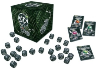 Wazabi. Несерьёзная игра на кубиках от Gigamic для 2-6 игроков. В небольшой квадратной коробочке находятся 36 карт, 24 кубика и правила. В начале партии всем участникам раздаётся по 4 чёрных куба. Всё – можно начинать. Да-да, даже нет необходимости читать правила – игра основана на бросках кубиков и проходит под патронажем случая. Свойства карт легко можно понять по рисункам, плюс они также описаны на специальных картах-памятках.