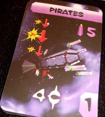 Дождались! Космические пираты – как же без них. Снова проверка на пушки, которые у нас благополучно отвалились в начале полёта. Кидаем кубик и получаем от кровожадных пиратов в правую часть кораблей. Отвалилась, так, ерунда, главное, что грузы в порядке, двигатели на месте и одинокие пилоты всё ещё за штурвалами.