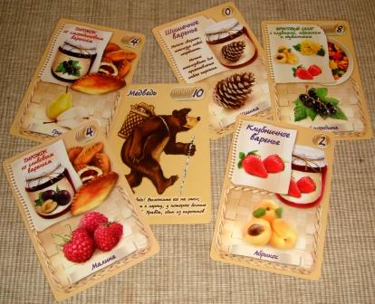 В колоде с рецептами есть и несколько особых карт – три карты салата (можно приготовить из трёх ингредиентов из корзины), Медведь (даёт очки за пирожки) и Карлсмен (даёт очки самому щедрому на варенье игроку). Жаль, что специальных карт очень мало – они бы привнесли больше веселья и разнообразия, особенно для детей.