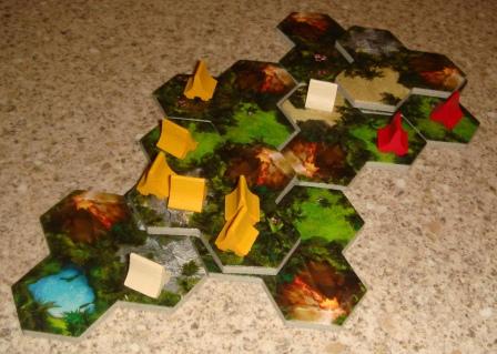 Совсем забыл о самом главном и интересном моменте игры. А что может быть интереснее, чем возможность напакостить сопернику? Дело в том, что на одной из сторон тайла местности изображён извергающийся вулкан. На нём строить ничего нельзя, но, возводя следующий уровень острова, игрок прикладывает вулкан к вулкану, провоцируя тем самым смертоносное извержение. Лава поглощает постройки, находящиеся под этим самым тайлом-извержением. Ну а что вы хотели, нечего тут расстраиваться в зоне повышенной сейсмоопасности.
