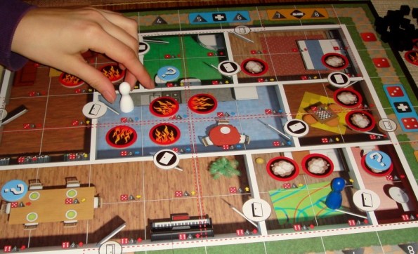 Первую партию мы отыграли минут за 30 (с парой ошибок, см. картинки ниже). Решили, что будем тушить огонь только по необходимости, ну, чтобы можно было вывести жертву. Погорячились. Недооценили последствия взрывов, и господин случай тройным попаданием в одну и ту же клетку с жетоном пламени быстро поставил пожарных-кадетов на место.