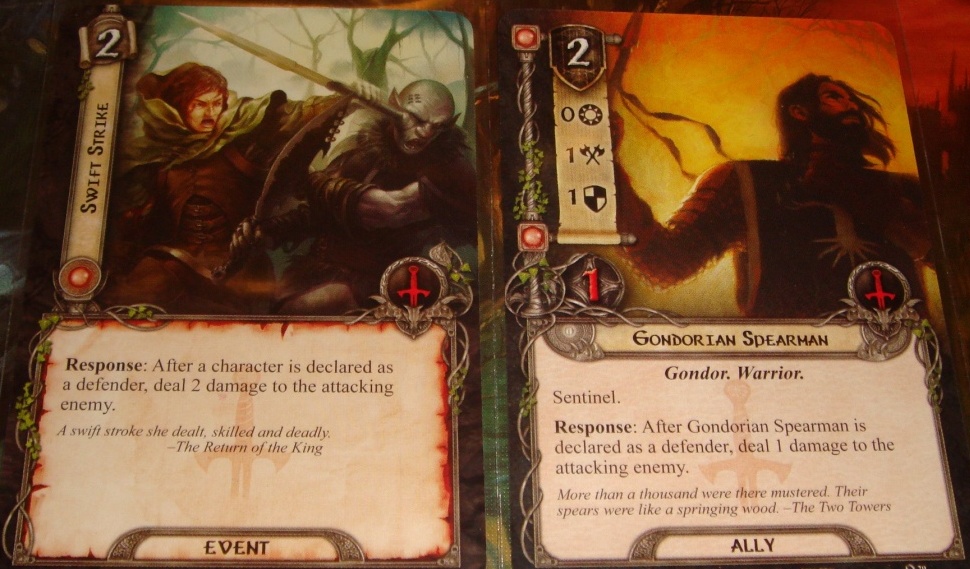 Отличная связка, позволяющая при успешных атаках совершать продвижение по квесту. Но тут есть ещё один момент: т.к. игрок сам выбирает порядок, в котором разыгрываются эффекты Response, то это даёт возможность “перенести” фишку продвижения с пройдённой карты квеста на следующую.