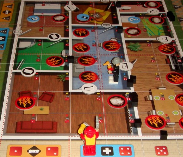 Flash Point: Fire Rescue мы разложили с Катей, чтобы опробовать фигурки пожарных. Нормальных миниатюрок отыскать пока не удалось, поэтому пока решили довольствоваться вариантом из конструктора. Выбор пал на недорогую пародию на “Лего”, комплектик с двумя пожарными. Сами по себе человечки неустойчивые, но если их прикрепить на подставку, то они перестают падать, и играть ими становится довольно удобно.