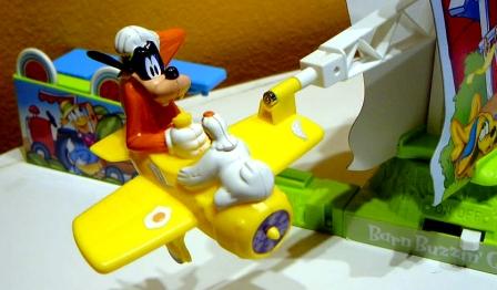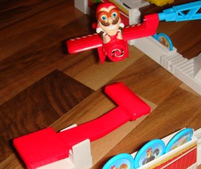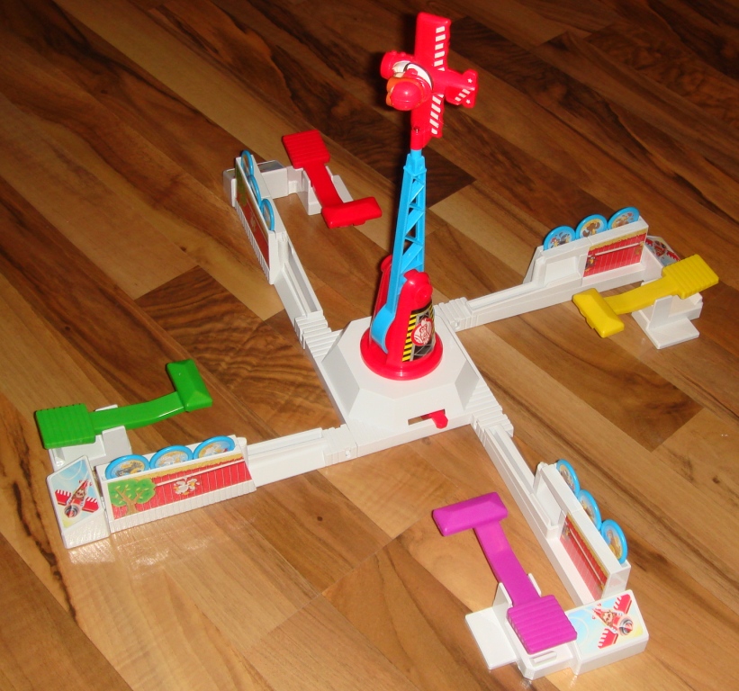 В середине конструкции находится крутящаяся установка с самолётиком. В самолёте ни кто иной, как проказник Луи. Питаемый батарейкой, он носится по кругу на своём кукурузнике и так и норовит сбить ваших куриц. Если, пролетая мимо, шасси самолётика задевают курочку, то она моментально падает с насеста. У каждого игрока под охраной всего три курочки.