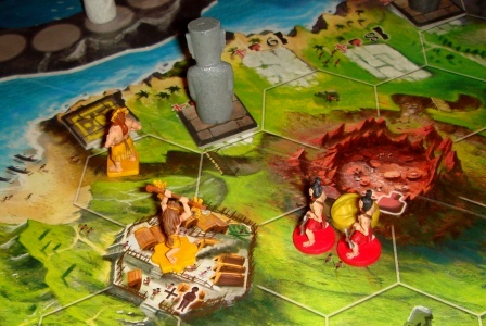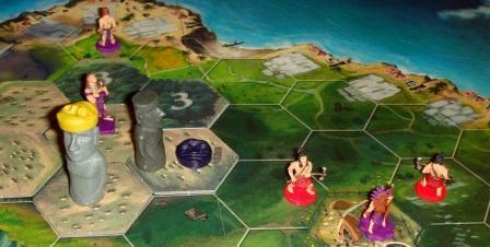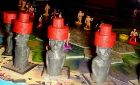 Напомню, что важную роль в транспортировке свежевысеченных скульптур играет рабочая сила соперников. Без „вражеских” трудяг довольно сложно доставить Моаи или шапочку на отдалённые участки острова. При игре вдвоём дефицит рабочих компенсирован нейтральным племенем. Перед игрой возьмите 6 фигурок простых рабочих любого, не участвующего в партии цвета, и закиньте их в общий “котёл”.