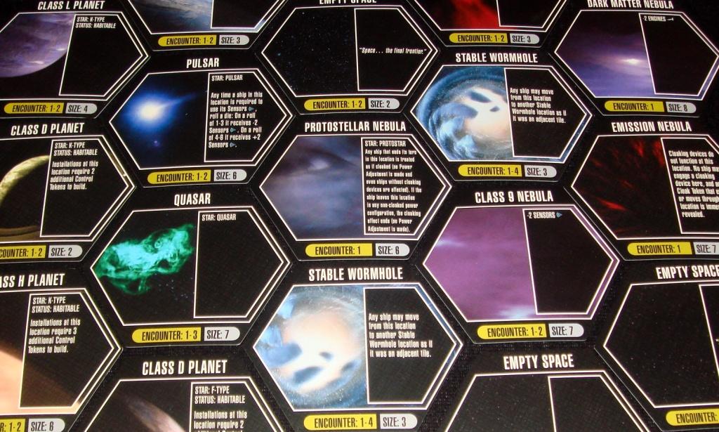 На пути можно встретить не только бескрайние космические просторы, но и необитаемые планеты, различные туманности и т.д. Интересен момент с передвижением через локацию. Каждая из них имеет размер. Допустим мы летим через гекс с рамером 4, это означает, что чтобы пересечь данную локацию, мощность двигателя корабля должна быть 4 или выше.