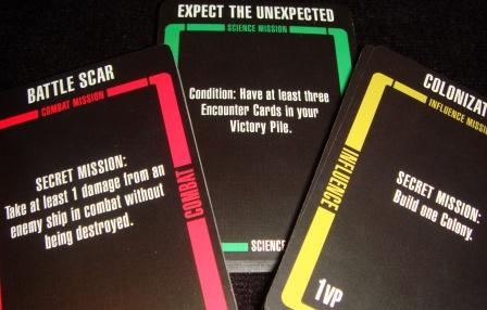 76 карт миссий делятся на 3 вида: научные, боевые и влияния. Миссии – это основная цель игры, за их выполнение игроки получают очки. Задания очень разные: от получения ранения в бою (именно получения – называется “боевой шрам”), до колонизации планеты.
