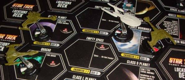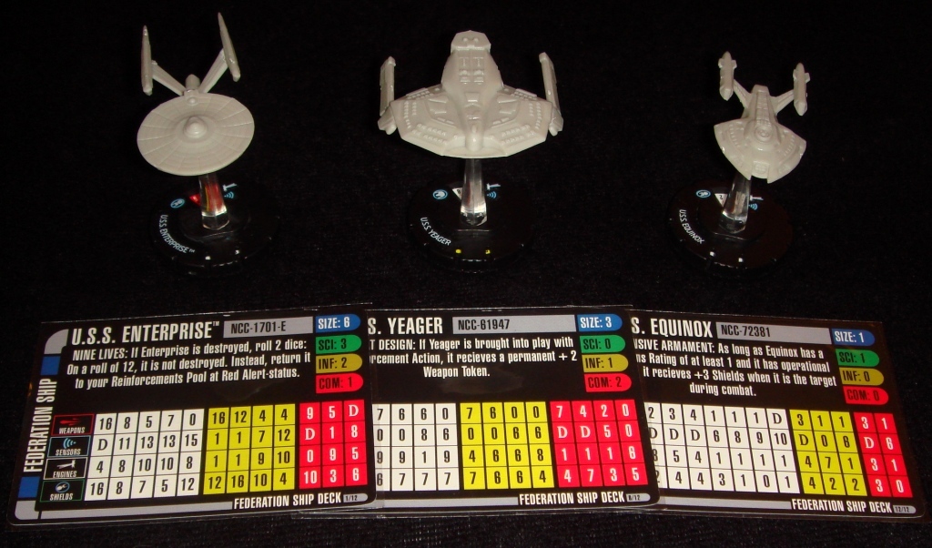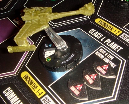 Например, 2 корабля Федерации нападают на 1 корабль клингонов. Игрок складывает значения орудий двух кораблей, бонус боевого приказа, значение на кубике и в результате получает 21. Корабль клингонов имеет щиты на 4, плюс в корабле сидит инженер, дающий +2 к щитам, плюс на кубике выпадает 3, итого 9. 21 больше 9, значит, корабль клингонов подбит. Количество ранений вычисляем простым делением: 21>9 более чем в два раза, значит, корабль получает два ранения, т.е. игрок поворачивает счётчик на два деления вправо, с белого уровня тревоги на красный. Ещё одно ранение, и корабль клингонов взорвётся.