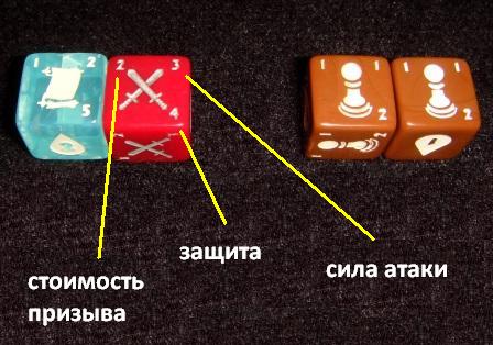 В примере выше сила атаки кубиков (слева) равна пяти, и это значит, что оба кубика противника с защитой два (справа) не доживают до фазы получения славы и уходят в сброс.