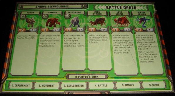 2. Движение. В этой фазе игрок может походить каждым отрядом. Как правило, отряды ходят на 1 гекс, но некоторые свойства позволяют отдельным видам существ передвигаться на 2 гекса. Также есть некоторые ограничения по типам местности, например, на монолит могут взойти только Драконы, Лава Риперы и Пауки. Все нюансы передвижения указаны на справочных листах и для удобства дублируются на тайлах местности.