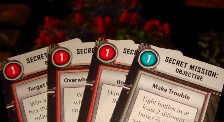 По ходу партии игроки получают секретные задания, за выполнение которых даются победные очки. Задания разные, например – уничтожить 1 отряд соперника определённого вида или контролировать тот или иной тип местности. Как только условие миссии выполняется, игрок вскрывает карту и кладёт перед собой.