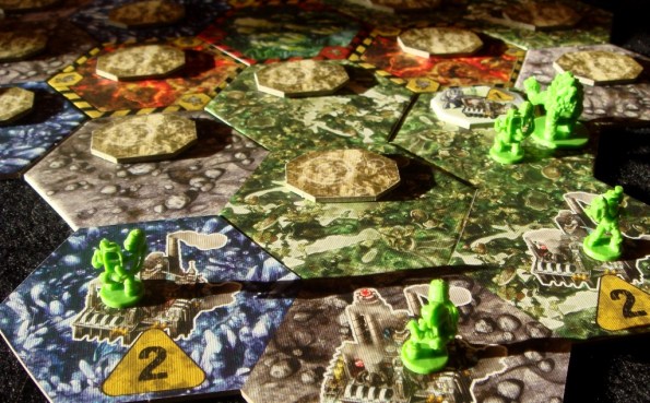 В правилах от FFG присутствуют интересные режимы игры: с дополнительными жетонами исследования, “Царь горы” – когда игрок получает очки за контроль монолита и т.д. Из всех предложенных спорным мне показался только “Vortex”, где в центральном тайле находится некий водоворот, который по воле кубика засасывает отряды и швыряет их налево и направо.