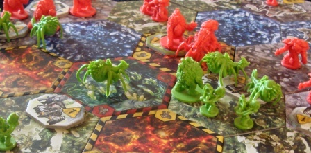 Претерпев косметические изменения, компоненты игры обрели современный FFG-шный вид. Невзрачные тайлы местности, фишки рубиума, и безликие карты поддержки обзавелись ярким оформлением и иллюстрациями, а полупрозрачные фигурки отрядов хоть и потеряли свою оригинальность, но стали более детализированы. Единственной утратой стал центральный тайл – монолит. Я считаю, что для пущей атмосферы он должен гордо возвышаться над прочей местностью. Напомню, что в старой версии для этой цели была специальная картонная подставка, тут же монолит никак не выделяется. В общем, подпортили они этим монолитом хорошее впечатление от новых компонентов.