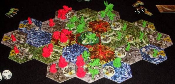 4. Сражение. В этой фазе происходят бои на каждом оспариваемом гексе, т.е. там, где находятся отряды двух и более разных сторон. Сражения разыгрываются с помощью кубиков. Отряды атакуют друг друга в обратной последовательности, как они стоят в справочных листах. Т.е. первыми всегда атакуют Драконы, а последними люди. Каждый отряд участвует в сражении только один раз и кидает 1 кубик. При каждом попадании противник должен убрать с поля один отряд. Как видно, бои тут происходят не до последнего выжившего, и часто после того, как все отряды атаковали, гекс всё ещё остаётся спорным.