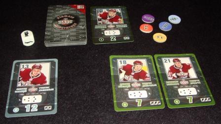 В состав игры входят: 25 карт (среди которых 20 хоккеистов, 4 тренера и 1 врач), 5 ширм, 1 кубик, 6 наклеек для кубика и 74 жетонов денег. Компоненты вполне приличного качества, разве что ширмы и карты могли быть потолще. Кубик деревянный, грани, правда, придётся наклеить. Жетоны вырублены хорошо, картон толстый. Текст на карточках, как и правила, на двух языках, на латышском и русском, что тоже радует.