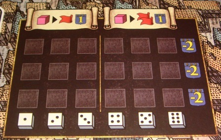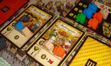 Для активации карты вам понадобиться свободный мипл, некая сумма и указанные на карте кубики. Платим монетки, ставим мипла на одно из двух делений с победными очками (они приплюсуются к жетонам ПО в конце партии), используем от одного до трёх кубиков и получаем выгоду.