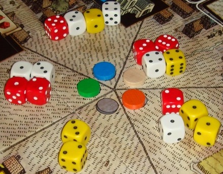 После этого игроки берут кубики соответствующих цветов по количеству миплов в областях влияния и одновременно бросают их. Все кубы аккуратно складываются рядом с дисками игроков в центре города. Казалось бы, на этом этапе нужно радоваться успешным броскам, но не стоит торопиться, так как игроки могут покупать друг у друга кубики, и может случиться так, что до вас дойдут только двойки да колы. Хотя и этому не следует отчаиваться – на неудачные броски можно влиять, вы не поверите, очками влияния (ОВ). В любой момент своего хода игрок может за 1 ОВ перебросить один свой кубик или за 4 ОВ перевернуть до трёх кубов на противоположную сторону, тем самым превращая единицы в шестёрки.