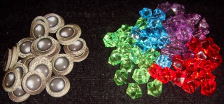 Поиском ресурсозаменителей для Lord of the Rings: The Card Game я занялся с самого начала знакомства с игрой. Уж очень хотелось заменить эти серые скучные фишки на цветные жетоны для каждой из сфер влияния. Изначально хотел круглые стекляшки по типу таких…