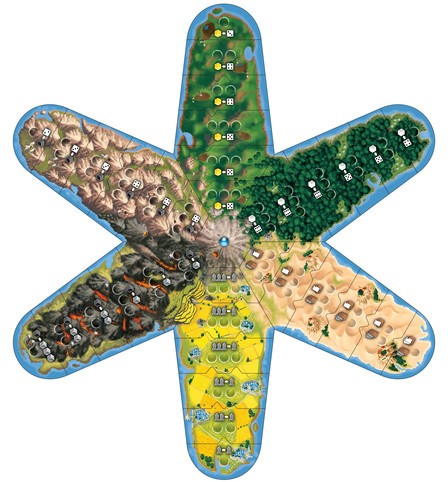 Чем дальше регион расположен от центра, тем легче добыть указанный на нём ресурс. Также на регионах варьируется число мест под рабочих. Например, лес, расположенный дальше всего от центра добывается броском на 4, 5 или 6, но имеет всего одно вакантное место, и наоборот, расположенное вблизи центра месторождение кристаллов приносит ресурс только при выпадении 6-ки, но на нём одновременно могут находиться до трёх трудяг.