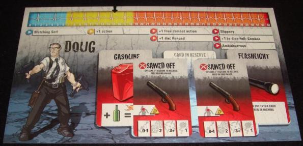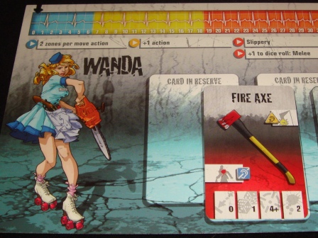 Атака. Если в зоне с зомби есть выживший, то зомби тут же его кусают. За каждый укус персонажу вручается карта ранения, которая идёт в инвентарь вместо предмета по выбору игрока. Другими словами зомби сначала выбивает оружие из рук жертвы, а потом впивается в тельце своими гнилыми зубами. Исходя из количества слотов на листе персонажа, можно подумать, что у героя 5 жизней, но, увы, их всего 2. Достаточно позабыть о двух затаившихся зомби, и ваш герой – труп.
