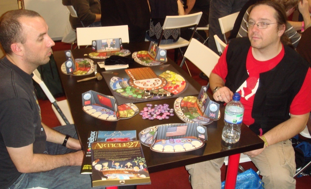 Новая игрушка от Stronghold Games на переговоры Article 27. Игроки являются членами Совета безопасности ООН, которым нужно выносить на обсуждение различные предложения и участвовать в голосовании. Уже от одного описания мне становится скучно, но говорят, любителям negotiation игра должна понравиться. Хотя молоточком по столу я бы постучал.
