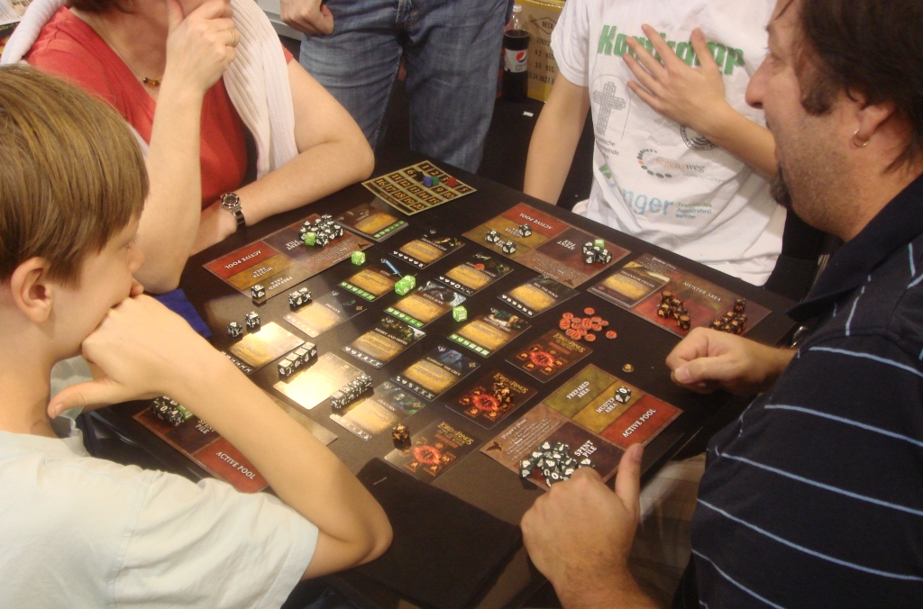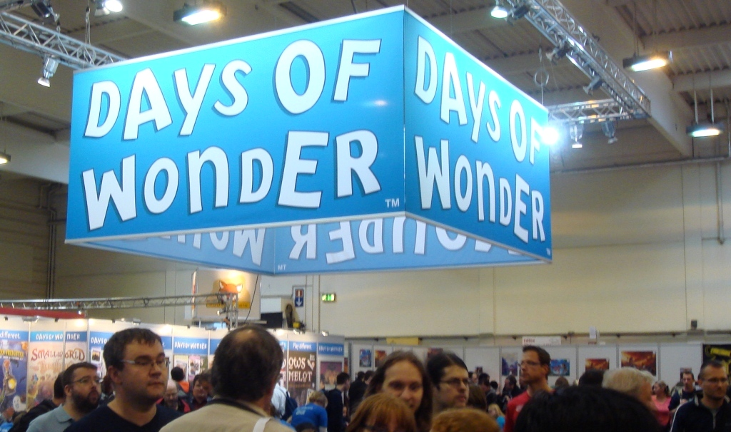 Days of Wonder запомнился не только этим здоровенным рекламным щитом, но и карточными Тенями над Камелотом, в которых в основном рубились за столами этого издателя. В новых Тенях тоже есть предатель, а квесты нужно проходить с помощью… памяти. Вскрываешь карты со значками разных квестов, а потом все решают, когда остановиться. Если сумма цифр на картах одного квеста от 11 до 13, то квест пройден, и игроки получают белые мечи, если меньше или больше, то чёрные. Есть ещё всякие специальные карты, которые разнообразят игру и вносят немного хаоса. Меня карточные Тени как-то не привлекли, тем более, дома лежит нормальная версия с дополнением.