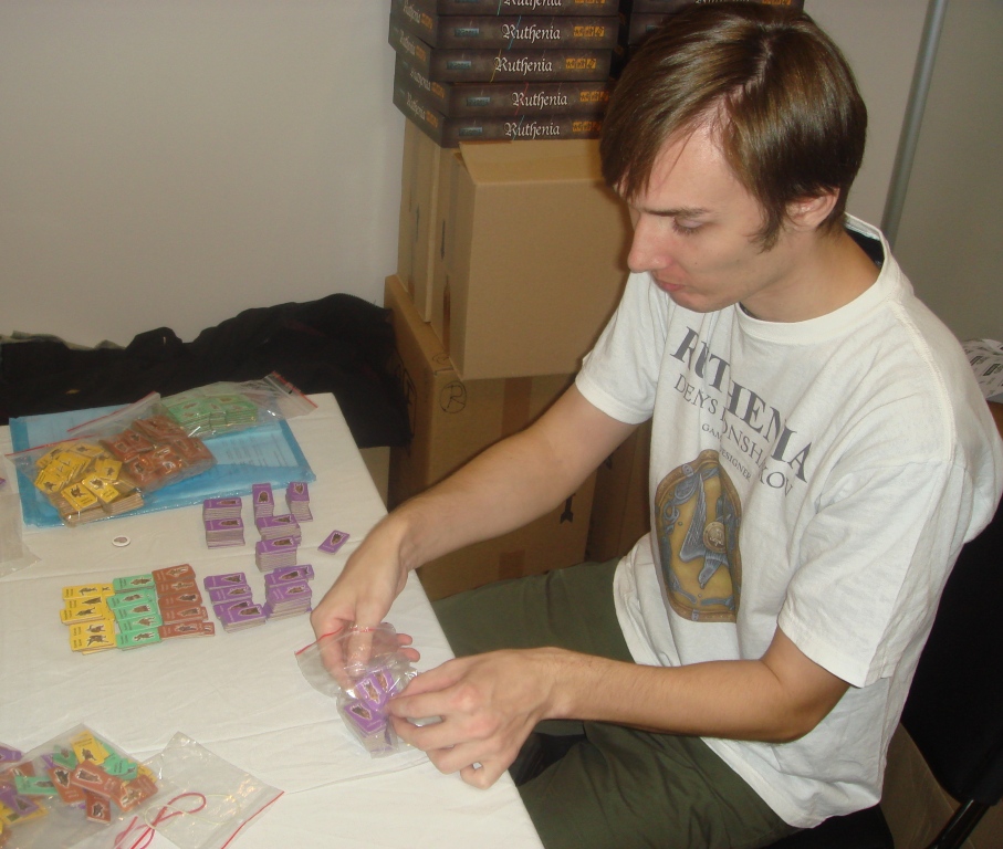 К ребятам мы подходили несколько раз, много общались и старались как-то отвлечь их от рутинной сортировки компонентов, так как игры к ним пришли в разобранном виде. Денис занимался презентацией игры, рассказывал правила, а Саша сидел по голову в фишках и жетонах, и вероятно пожалел о том, что в их игрушке столько компонентов. Кстати, компоненты хорошего качества, а цвета так вообще приятные и не избитые.
