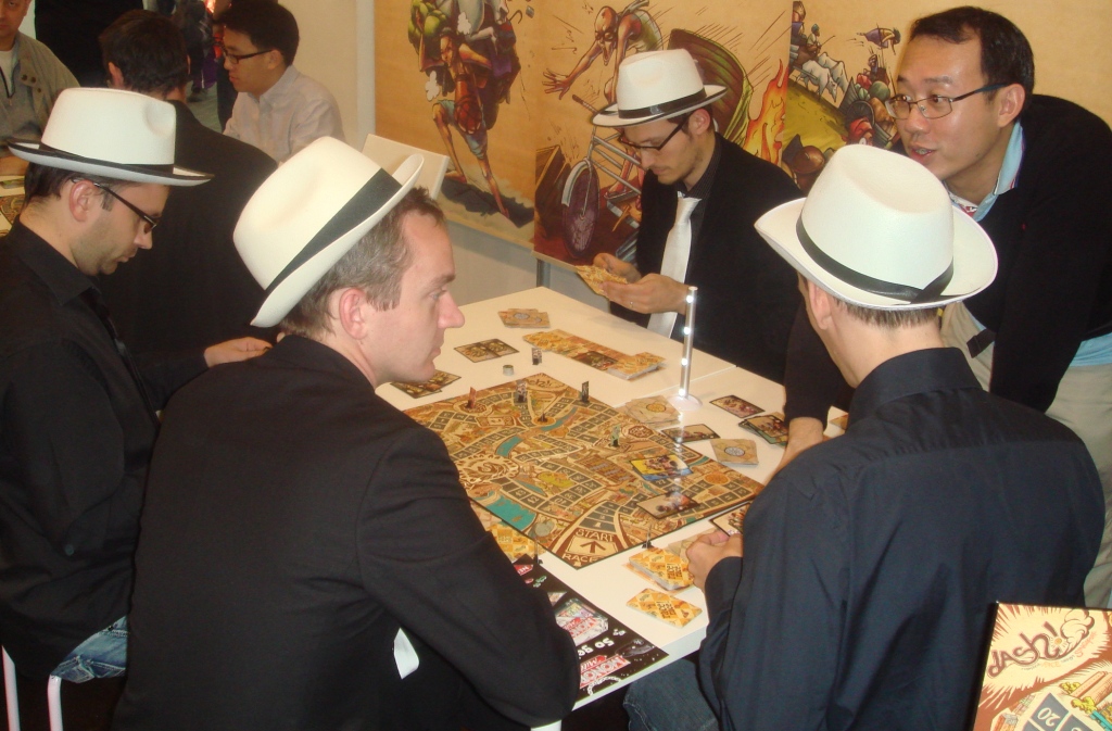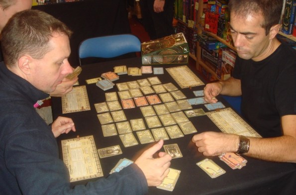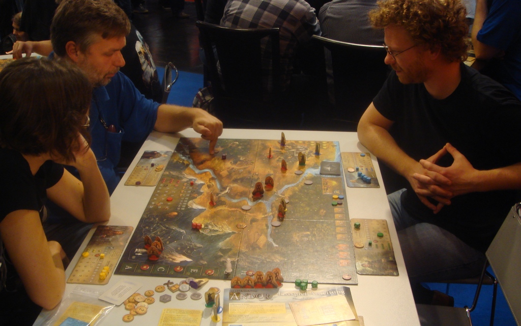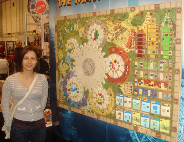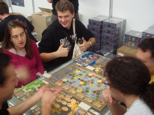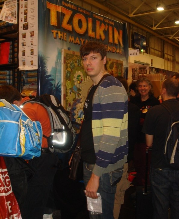 Ричийс играет в Terra Mystica с Эми из Big Bang Theory :). Потом он (да и не только он) скажет, что это одна из лучших игр выставки. Мне Терру опробовать, а уж тем более купить, не удалось – в первый день отдавать 60 EUR было как-то стрёмно, а потом уже поздно, да и хватило с меня евро.