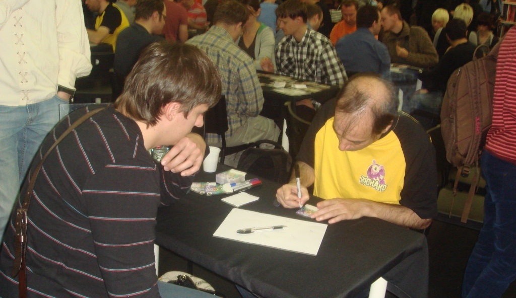 Второй день начался с того, что мы простояли в очереди минут 40, чтобы автор King of Tokyo, и по совместительству и МТГ, Ричард Гарфилд расписался на промо карте “Подарок Гарфилда”, На фото я стою ехидный, типа “сейчас придумаю такое свойство, что мало не покажется!”