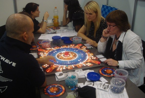 Большое поле Tzolkin с магнитными картами и фишками на стенде Czech Games Edition.