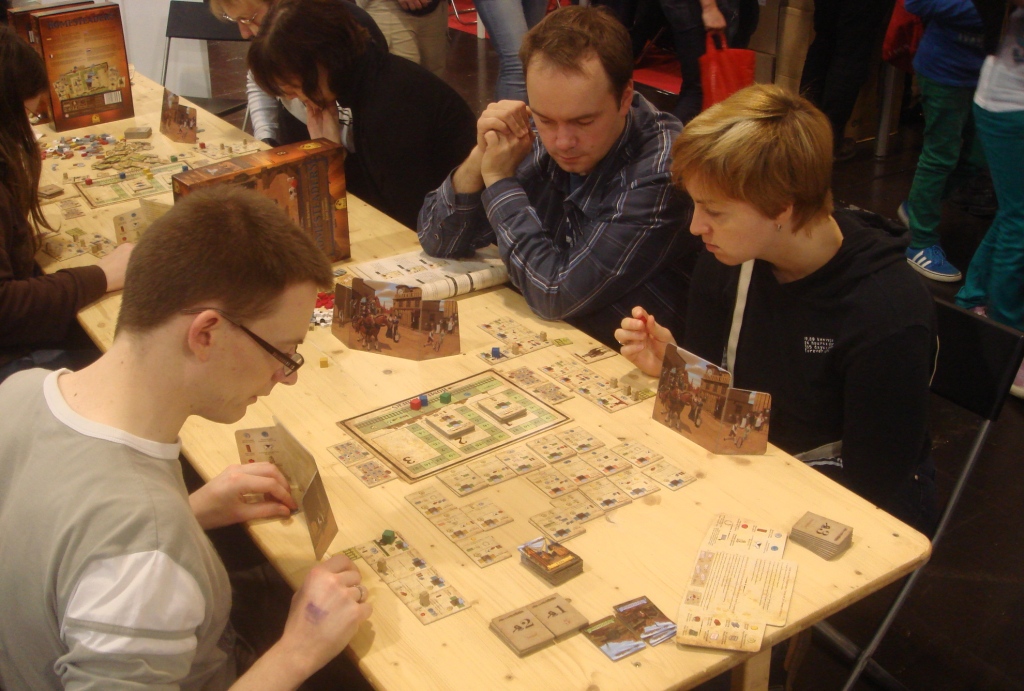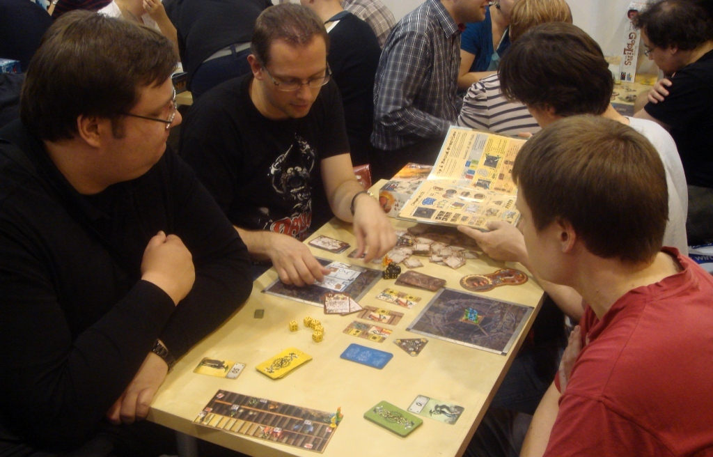 Вроде мы уже оклемались и даже потихоньку начали осваивать новинки, посему предлагаю вашему вниманию фотоотчёт (~80 фотографий) с комментариями о прошедшей выставке Spiel 2012. Из него вы узнаете, как мы добирались до Эссена, где жили, во что играли, кого встретили и многое-многое другое.