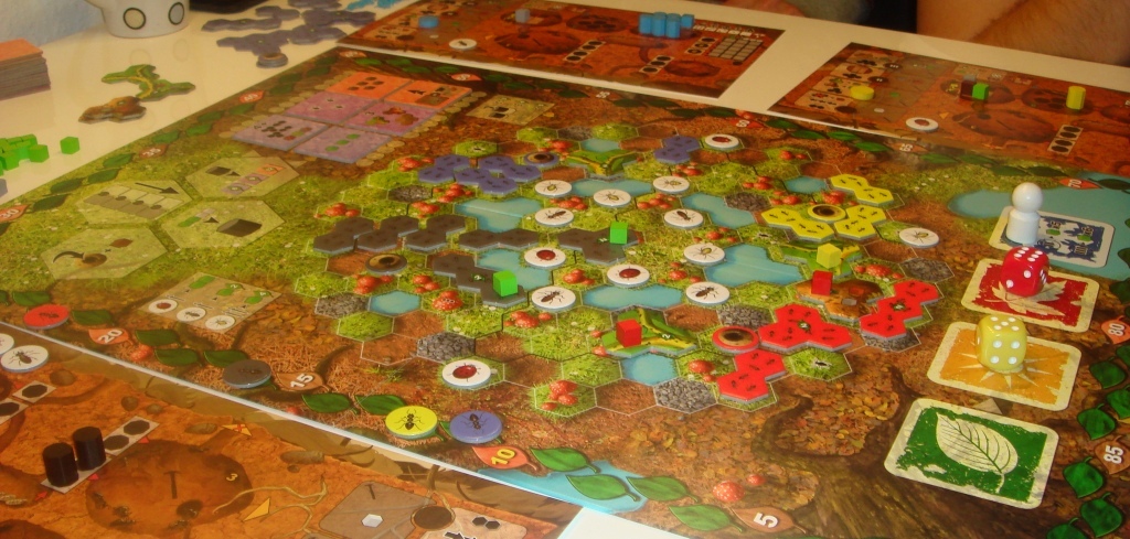 В Myrmes игроки руководят колонией муравьёв, которые исследуют территории, ищут пропитание, в общем, всячески борются за жизнь, как подобает любым мелким насекомым в опасной и безжалостной природной среде. По сути перед нами стратегическое евро с расставлением рабочих. Рабочими в данном случае выступают фишки маток, которые в зависимости от выбранного игроком действия могут откладывать личинки или рожать: муравья-трудягу, муравья-воина или ещё одну матку. Трудяги соответственно вылезают на поверхность, исследуют гексы местности и тем самым добывают ресурсы. Войны сражаются с другими насекомыми, обращая их в еду. Личинки тоже могут быть конвертированы в еду, также с помощью них игроки получают доступ к более широкому спектру бонусов каждый сезон. Игра поделена на 3 раунда, каждый из которых длится 4 сезона. Зимой свою колонию нужно прокормить… В игре ещё полно нюансов, всё не рассказать, но она стоит своих денег (по-моему, 35 EUR). Отдельно упомяну прикольную идею с феромонами, с помощью которых муравьишки метят свою территорию, а также, убирая их (тайлы феромонов), заметают свои следы. Отличное евро, вариативное (задания на партию выбираются случайным образом) с кучей способов заработка очков, и что редкость, очень атмосферное.