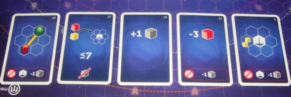 Также, кроме карт событий, для усложнения жизни космонавтам на игровом поле имеются опасные зоны – прилегающие к Солнцу гексы, пояс астероидов и центральная непроходимая зона с самим небесным светилом. Если корабль завершил движение в опасной зоне, то ему придётся заплатить щитом, иначе его ждёт эвакуация на планету, которую он посетил последней. Если честно, нам ещё ни разу не приходилось останавливаться в таких зонах, и мне кажется, что для пущего эффекта пояс астероидов нужно было сделать пошире 🙂