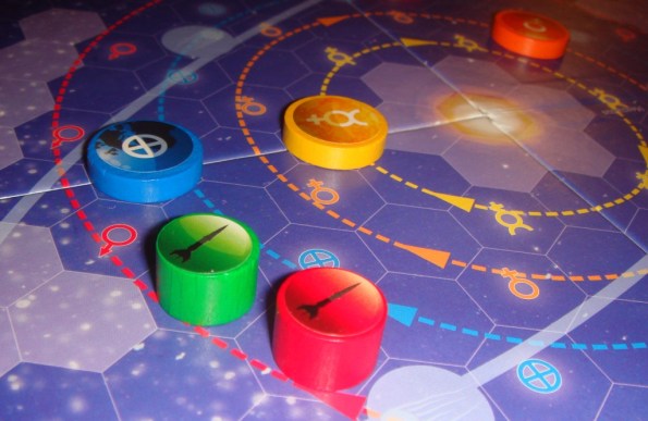 4. Фаза движения планет и кометы. Завершает каждый раунд фаза движения небесных тел, в которой все планеты и комета двигаются по орбитам на соседние деления по часовой стрелке. Приземлившиеся корабли двигаются вместе с ними, мы с Катей назвали это “покататься на планетах”. Иногда это очень помогает, особенно если “оседлать” комету.