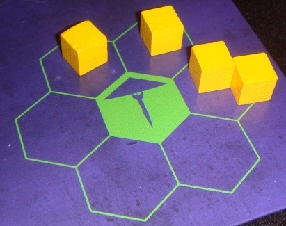 2. Фаза приказов. В этой фазе придётся хорошенько всё обдумать, так как во время неё игроки планируют полёт или решают остаться на дозаправку. Полёт зависит от того, как вы распределили топливо на так называемой розе направлений. Каждый кубик топлива на розе – это один гекс в указанном направлении. За раунд на розу можно положить до трёх кубиков.