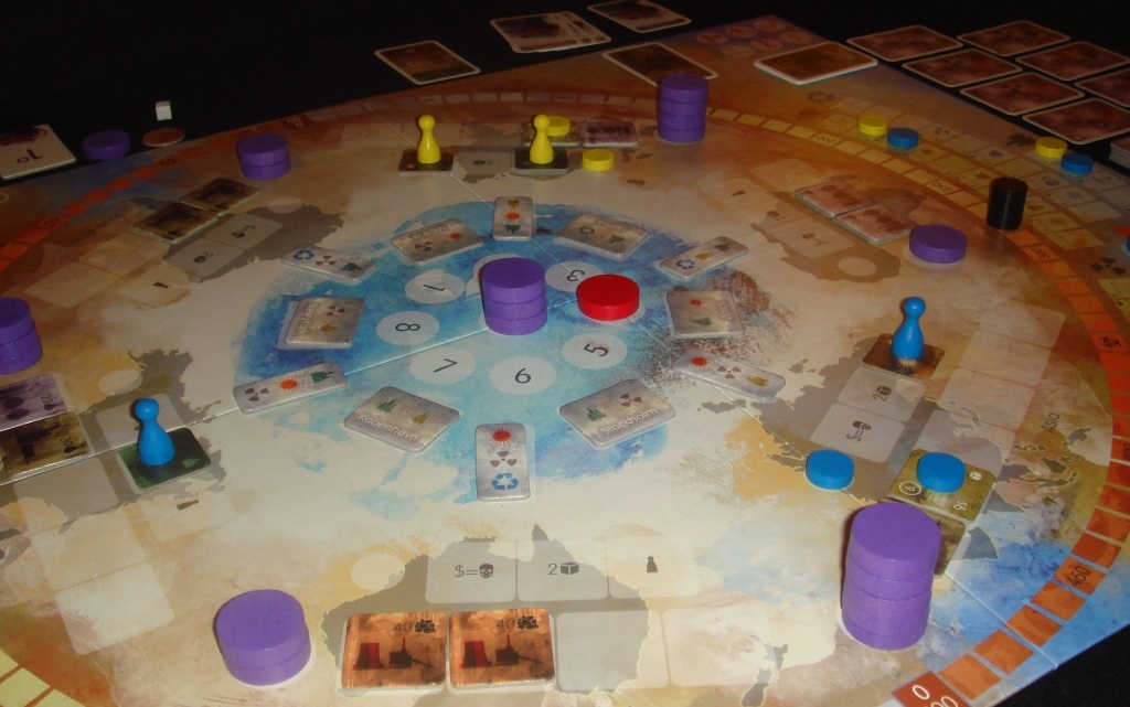 Давненько я не выкладывал фотообзоров, а тут просто не смог удержаться – уж больно мне приглянулся внешний вид нового творения от Vital Lacerda (автора Vihnos) CO2. Так что, не только тема загрязнения окружающей среды отличает эту евроигру от своих собратьев (описание игры с “компьютерными” картинками можно почитать тут), ещё в ней, на мой взгляд, очень стильное и “удобное” оформление: начиная с приятных пастельных тонов игрового поля и заканчивая большими деревянными дисками, цилиндрами и фишками.