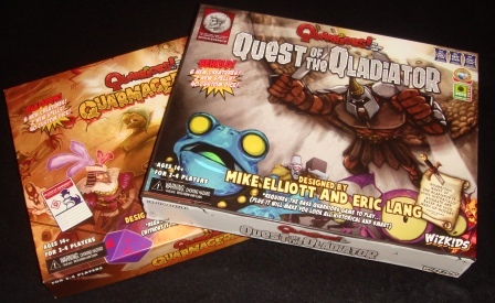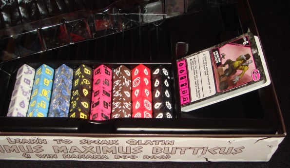 Новые кубики и карты вместе с базой и двумя другими дополнениями переехали в новую коробку от Quest of the Qladiator – она мне больше нравится, чего только стоит безумная лягуха на обложке.
