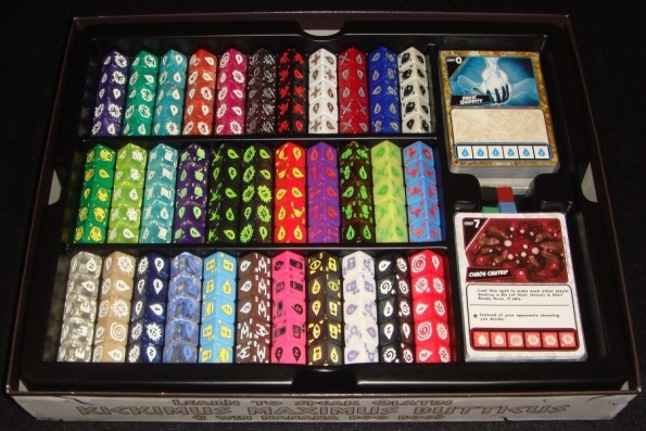 Теперь на первом этаже у меня все существа и заклинания, а на втором – все остальные “базовые” кубики. Карты в протекторах также свободно зашли, правда, ещё одно дополнение, и карты уже будут торчать. А дополнение будет, и не одно, в правилах Quest of the Qladiator был намёк.