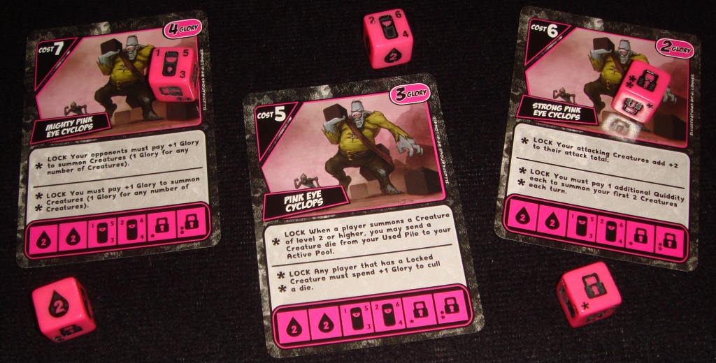 Pink Eye Cyclops. Добавляет существам +2 к атаке, позволяет перемещать использованные кубики в боевую зону или заставляет соперников во время призыва существ в дополнение к сущности платить 1 очко славы.